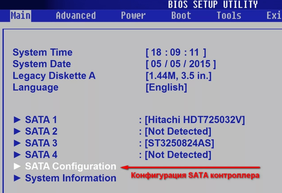 Итак, имею старый компьютер, который решил проапгрейдить и установить SSD диск. В БИОС переключил режим AHCI. Для этого зашел в БИОС (нажмите кнопку Del или F2 (могут быть и другие клавиши зависит от модели материнской платы), при включении компьютера) в меню «Main» выбрал «Sata Configuration».