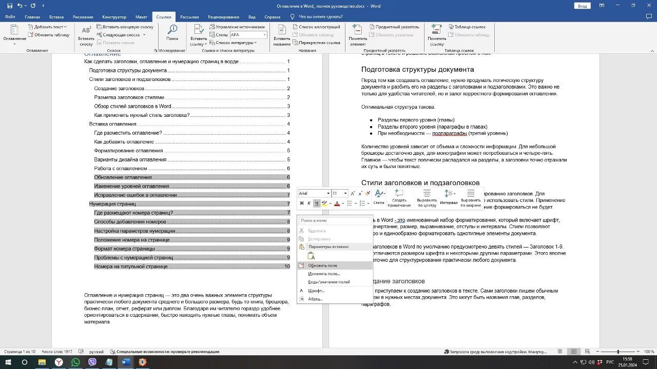 Оглавление готово, но на этом работа с ним не заканчивается. В процессе редактирования документа содержимое и структура могут меняться, будут добавляться или удаляться целые разделы. Эти изменения должны корректно отражаться в оглавлении. Рассмотрим основные сценарии.