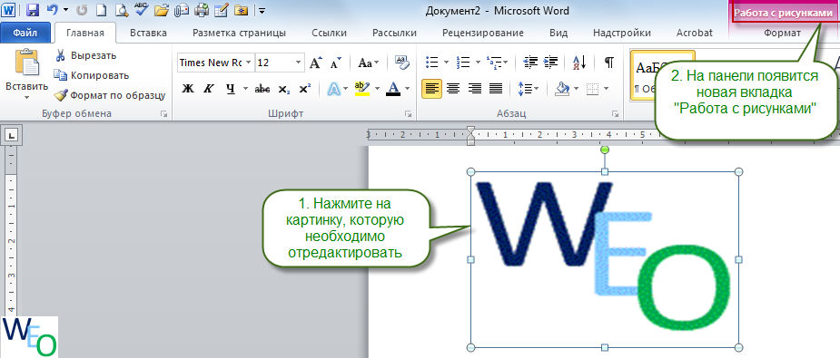 Для того, чтобы раскрыть возможности изменения рисунка в Word, для начала откроем документ, щелкнем один раз мышкой по картинке в документе и на панели появится новая вкладка «Работа с рисунками».