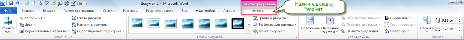 Далее нажмите на вкладку «Формат», что расположена под надписью «Работа с рисунками», и Word откроет панель для редактирования рисунков.