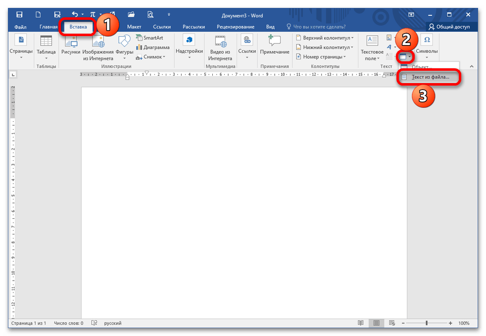 - Откройте документ и перейдите во вкладку «Вставка», блок «Текст» – «Объект» – «Текст из файла».