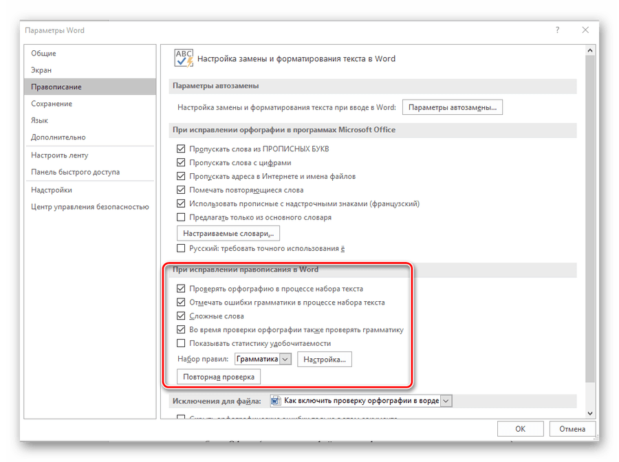 - В меню «При использовании орфографии в Word» установите флажки рядом с элементами.
